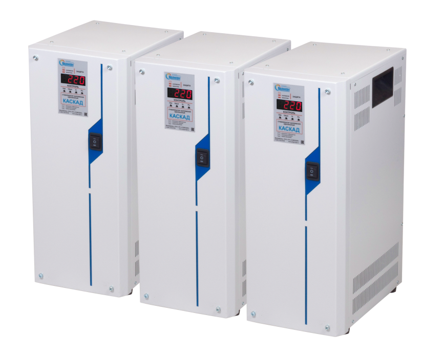 Трехфазные стабилизаторы "Каскад" мощностью от 12 до 60 кВА состоят из трех однофазных блоков и подключаются по схеме «звезда с выведенной нейтралью»;
