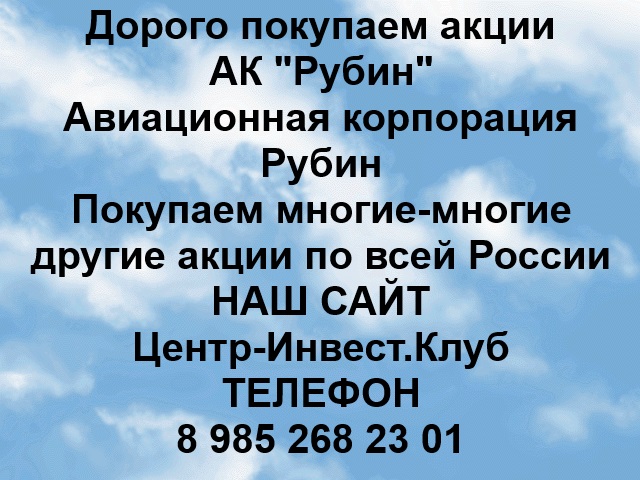 Дорого выкупим акции АК Рубин. Оплата наличными до сделки. Выкуп акций АК Рубин по рыночным ценам. Регистрация сделки по продаже акций АК Рубин - 20 минут. Если Вы хотите продать акции АК Рубин - звоните!