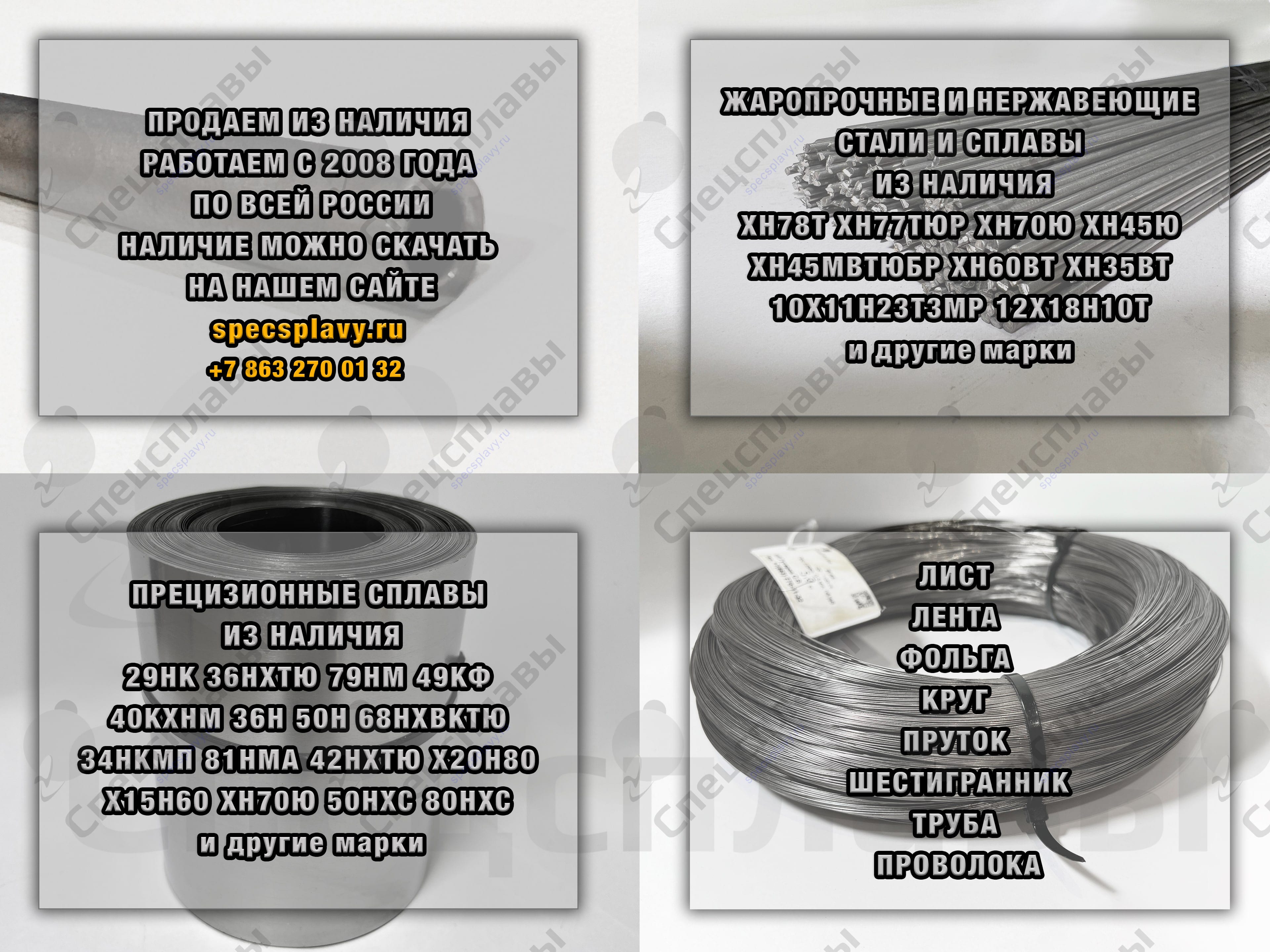 Проволока хн77тюр, хн60вт, 06х15н60м15, хн50вмтюб, 36нхтю, 29нк, 40кхнм и др. из наличия!ПРОВОЛОКА из наличия! ПРЕЦИЗИОННЫЕ СПЛАВЫ 52Н д.1,6 мм, 50,4 кг 36НХТЮ-Н д.1,2 мм, 97,9 кг 29НК д.3,0 мм, 96,2 кг 40КХНМ-Н д.1,3 мм 166 кг Ж...
