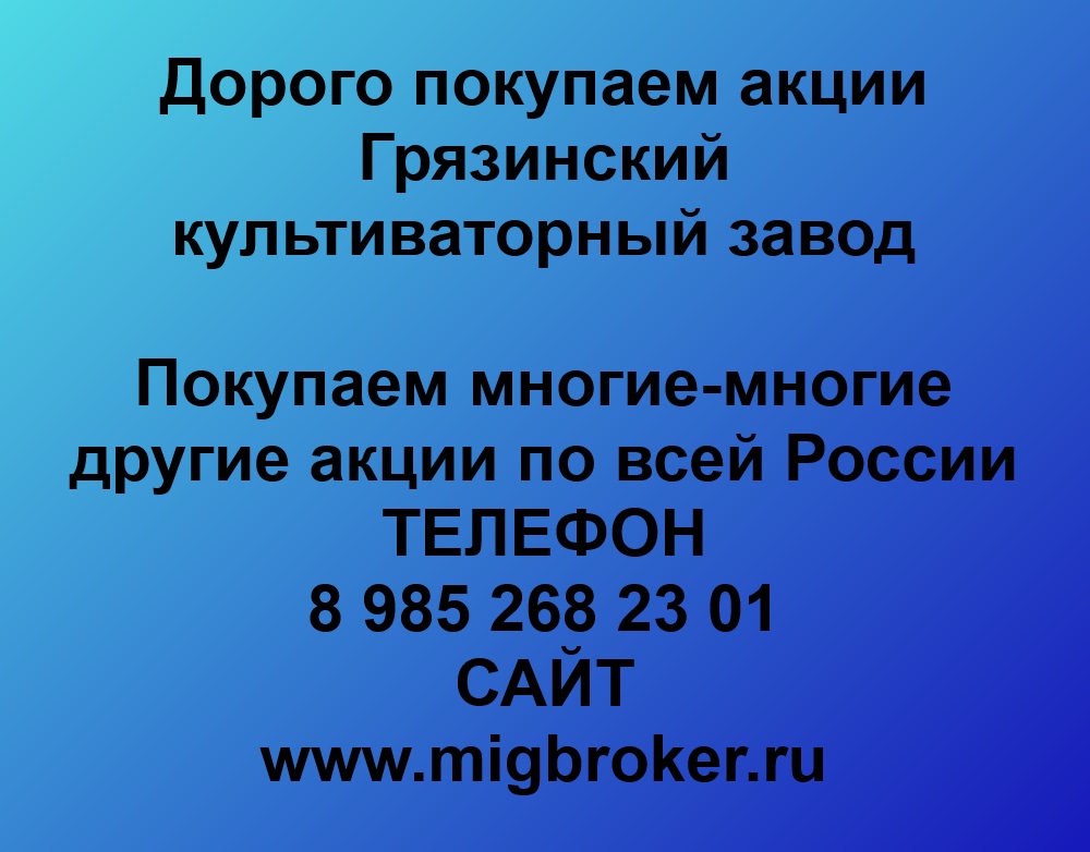 Открыть объявление »Хотите продать акции «Грязинский культиваторный завод»? Узнайте реальную цену и стоимость на сегодня. Оплата сразу до подписания договора. Работаем по...